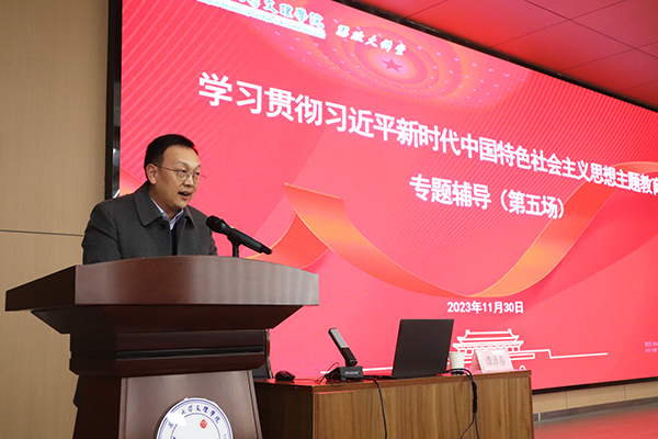 本网讯 11月30日下午,在新校区B-112学术报告厅,公司举办学习贯彻习近平新时代中国特色社会主义思想主题教育第五场专题辅导报告会,邀请荆州市委党校副董事长、校务委员会委员谭泽春来院作报告。党委书记颜建洲、副经理肖寒芝、党委副书记李则俊出席报告会,全体中层干部,各党总支、党支部委员,辅导员和各教学单位党员代表共两百余人现场聆听。