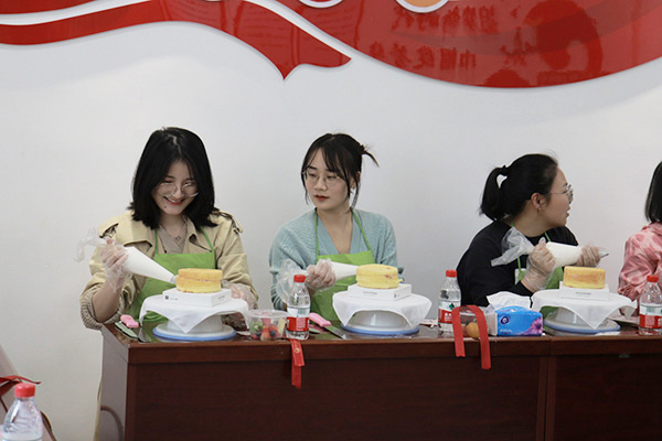 会议室里充满欢声笑语,洋溢着浓厚的节日气氛。女老师们在蛋糕师的指导下现场学习蛋糕制作,体验手工做蛋糕的快乐。经过精心设计和有创意的尝试,一个小时以后,一个个精美的水果奶油蛋糕呈现在眼前。