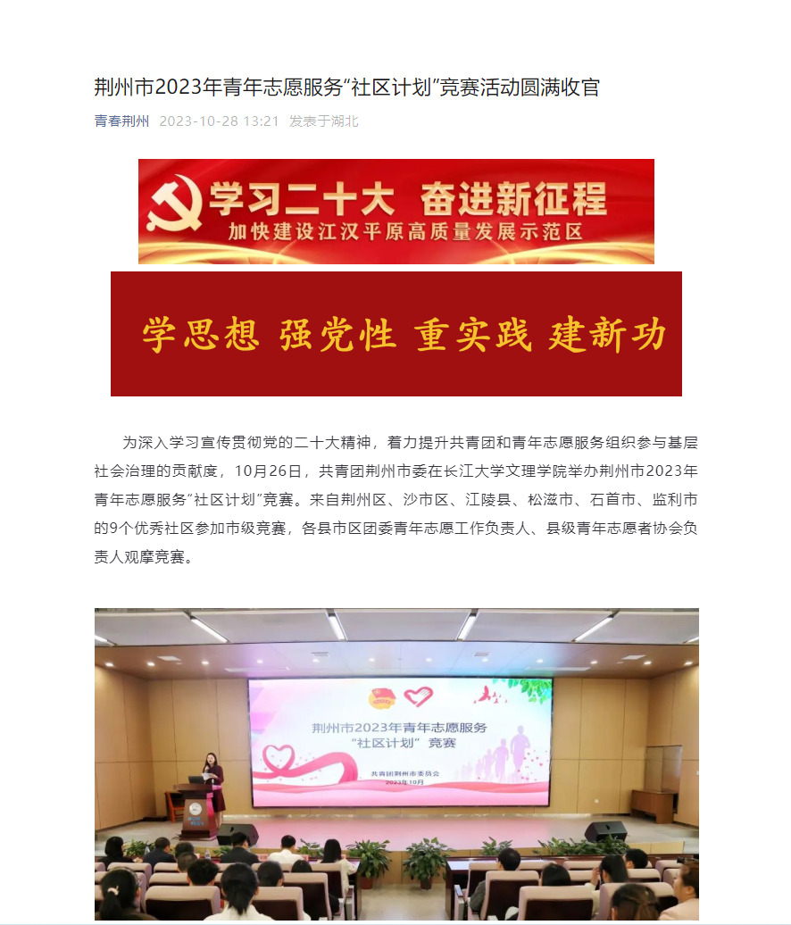 为深入学习宣传贯彻党的二十大精神,着力提升共青团和青年志愿服务组织参与基层社会治理的贡献度,10月26日,共青团荆州市委在太阳集团tyc9728举办荆州市2023年青年志愿服务“社区计划”竞赛。来自荆州区、沙市区、江陵县、松滋市、石首市、监利市的9个优秀社区参加市级竞赛,各县市区团委青年志愿工作负责人、县级青年志愿者协会负责人观摩竞赛。