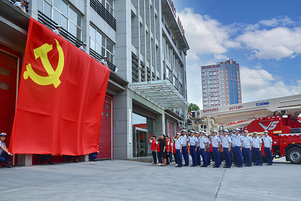 在消防救援大队门前,全体党员面对鲜红的党旗,高举右拳,重温入党誓词。在大队会议室,经济与法学系党总支副书记杨杉杉面向消防指战员和一批经法系老员工志愿者讲党课,加深大家对党史和新中国史的了解。讲课结束后,指战员和员工共同做手工,用大米拼成党徽、用粘土捏制党旗,在艺术体验中抒发爱党爱国热情。