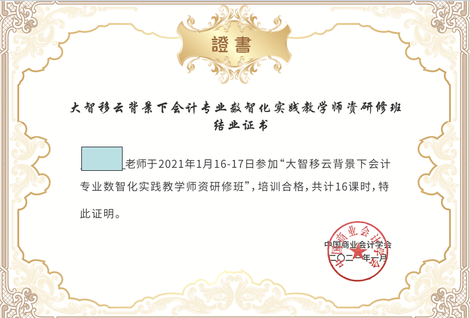 2021年1月16日-17日,我系部分教师全程参与了由中国商业会计学会主办、厦门网中网软件有限公司(正保远程教育控股子公司)承办的《大智移云背景下会计专业数智化实践教学团队研修班》并获取相关培训证书。
