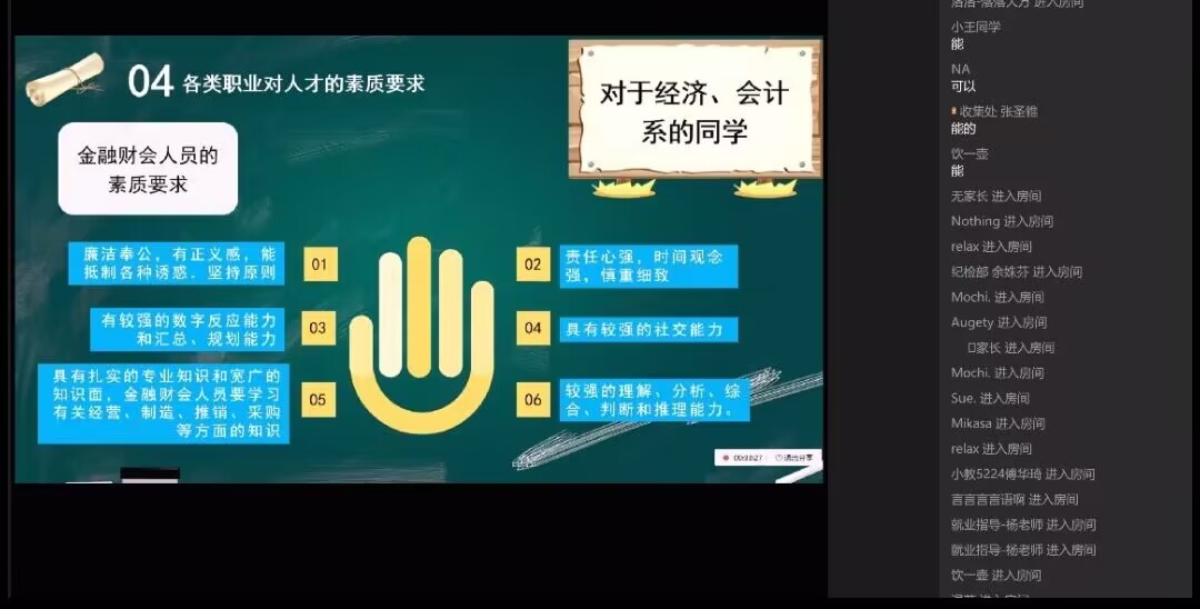 在分享会上,任老师向同学们介绍我们需要观念准备、心理准备、条件准备、行动准备;在就业时,要准备一个中心、两份材料、四个关注;在选择时,要慎重考虑,选择行业—选择人生赛道、选择公司—选择交通工具、选择岗位—选择助力方式。任老师深入浅出地告诉同学们各类职业对人才的素质要求以及老员工职业生涯规划的步骤。针对同学们提出的“怎样缓解就业压力”“在就业与创业之间如何进行抉择”两个问题,任老师耐心解答,缓解就业压力的核心就是不断地提升自己,让自己有竞争力;选择就业或创业的核心就是先要想清楚自己前进的方向,给自己一个定位。