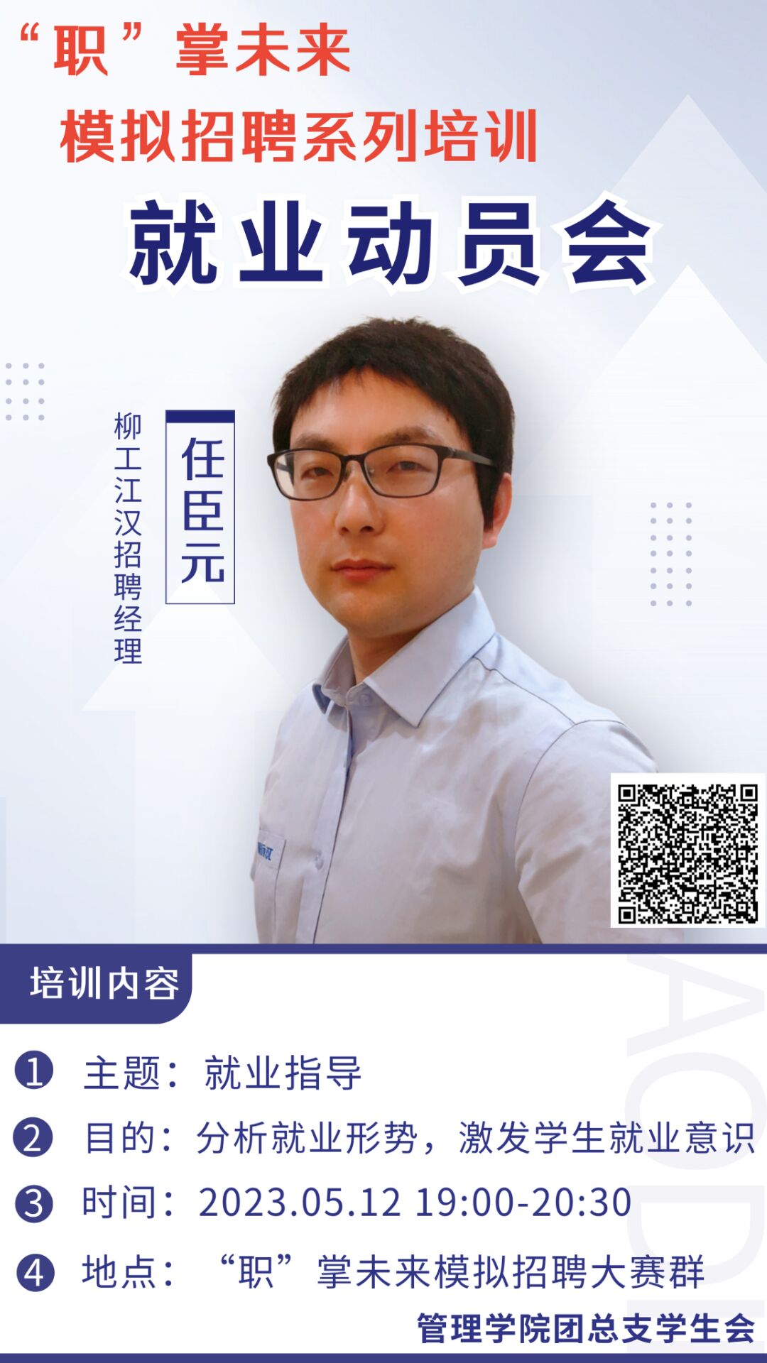 本网讯(通讯员 李颖)为了让同学们在毕业时遇到令人心动的offer,更深入了解目前社会的真实用人需求,管理公司特邀请从业8年人力资源管理工作的柳工江汉招聘经理任臣元老师,于5月12日19:00~20:30在线上QQ群课堂开展“扬帆起航,拨雾前行”主题分享会。
