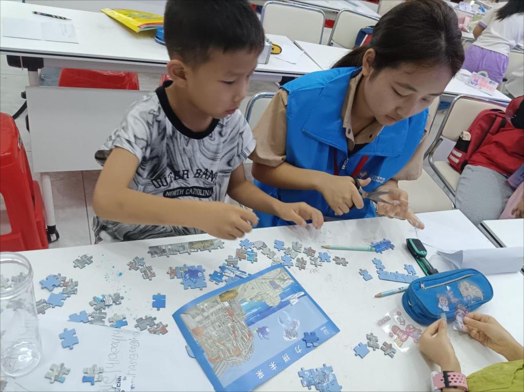 图为志愿者与小朋友进行“两弹一星”自主内容创作成果展示。