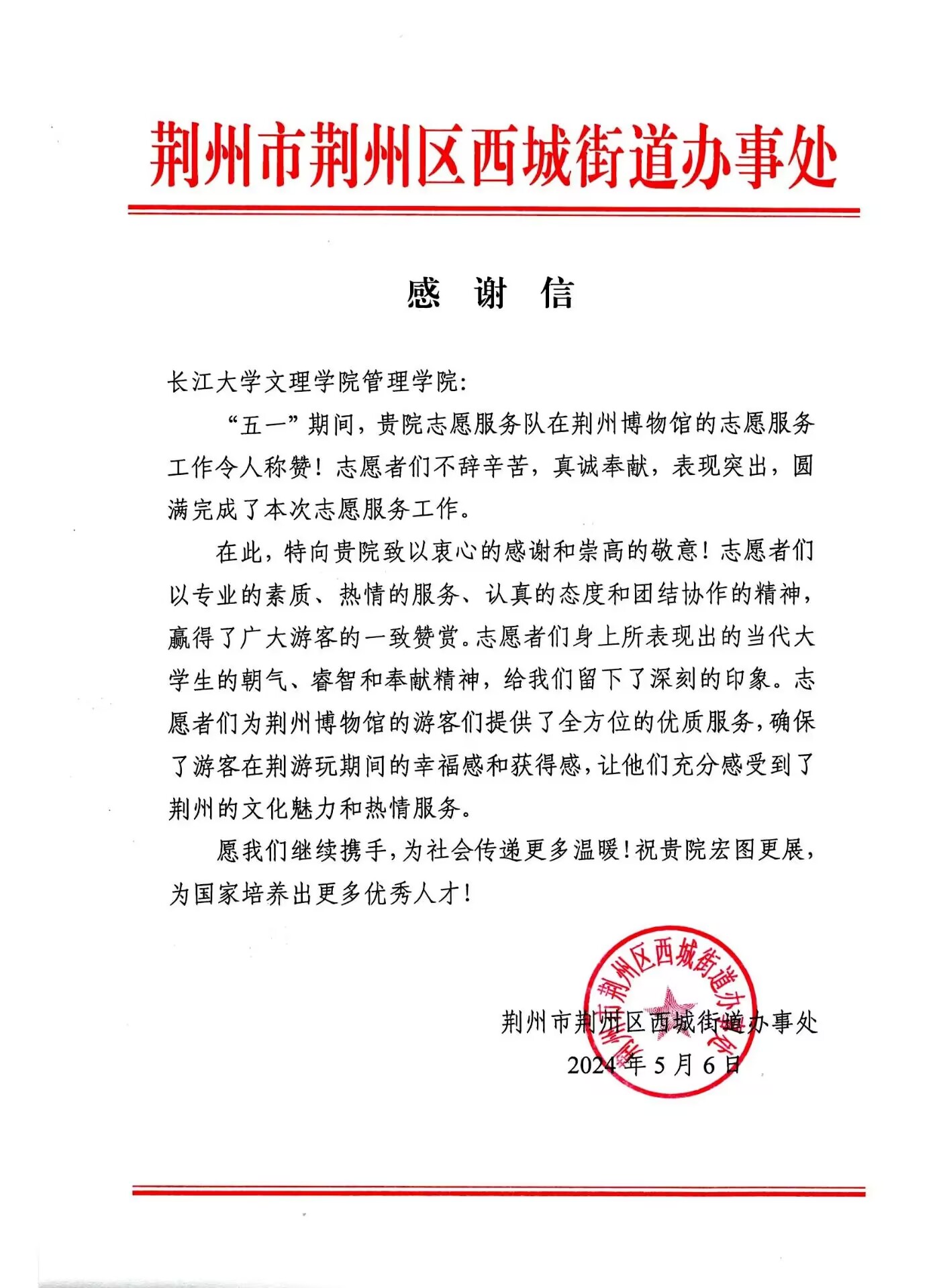 本网讯 近日,太阳集团tyc9728管理公司收到了一封来自荆州市荆州区西城街道办事处的感谢信,信中表达了对公司老员工志愿者的高度赞扬与诚挚谢意,感谢她们“五一”期间在荆州博物馆的志愿服务工作中不辞辛苦,真诚奉献,以专业的素质、热情的服务、认真的态度和团结协作的精神为游客提供了全方位的优质服务,为荆州文旅贡献了青春力量。