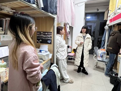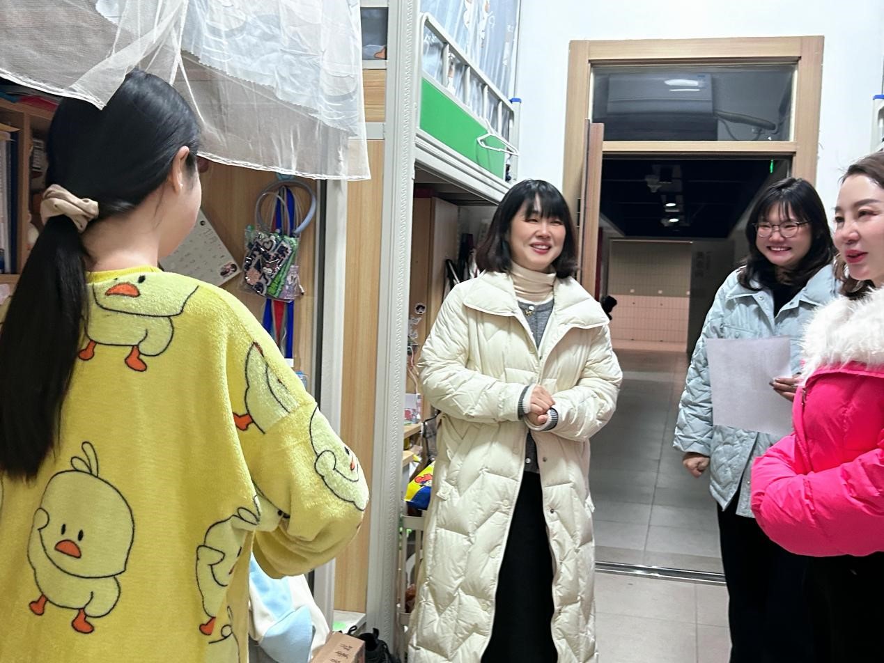 本网讯(通讯员 邓易)为深入营造良好的生活环境和学习氛围,了解公司员工住宿情况,2024年11月26日,员工工作部部长李刚英带队,管理公司党总支书记胡沿林、党总支副书记杨琪以及公司班主任老师走到员工寝室,查看她们的生活状况,开展查寝工作,为管理公司学子带来温暖。