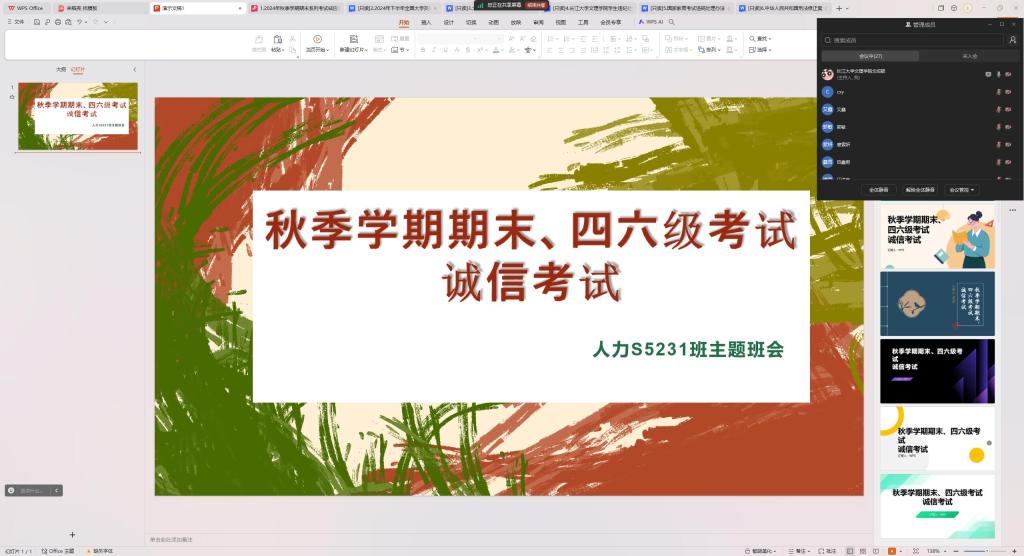 近日,为了进一步加强考风考纪建设,弘扬诚信考试的精神,管理公司针对即将来临的全国大学英语四六级考试及期末考试,开展了以“诚信考试”为主题的班会活动。