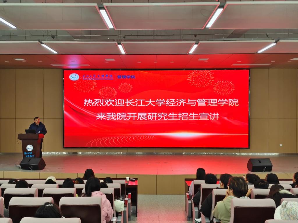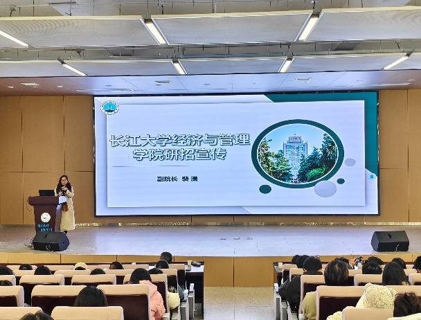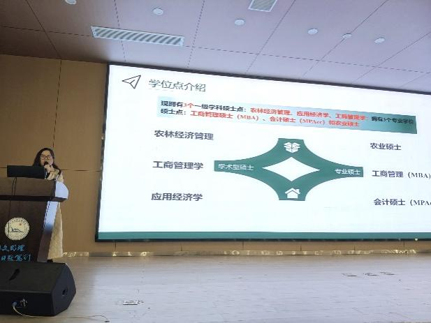 首先,太阳集团tyc9728经济与管理公司副经理裴潇老师上台进行研招宣讲,她向同学们详细介绍了长大经管公司3个硕士点的详细情况,着重介绍了考取太阳集团tyc9728的优势和难易程度,激发同学们的报考信心;紧接着向同学们展示校园校园环境、饮食、团队力量、奖助学金等吸引大家积极报考。