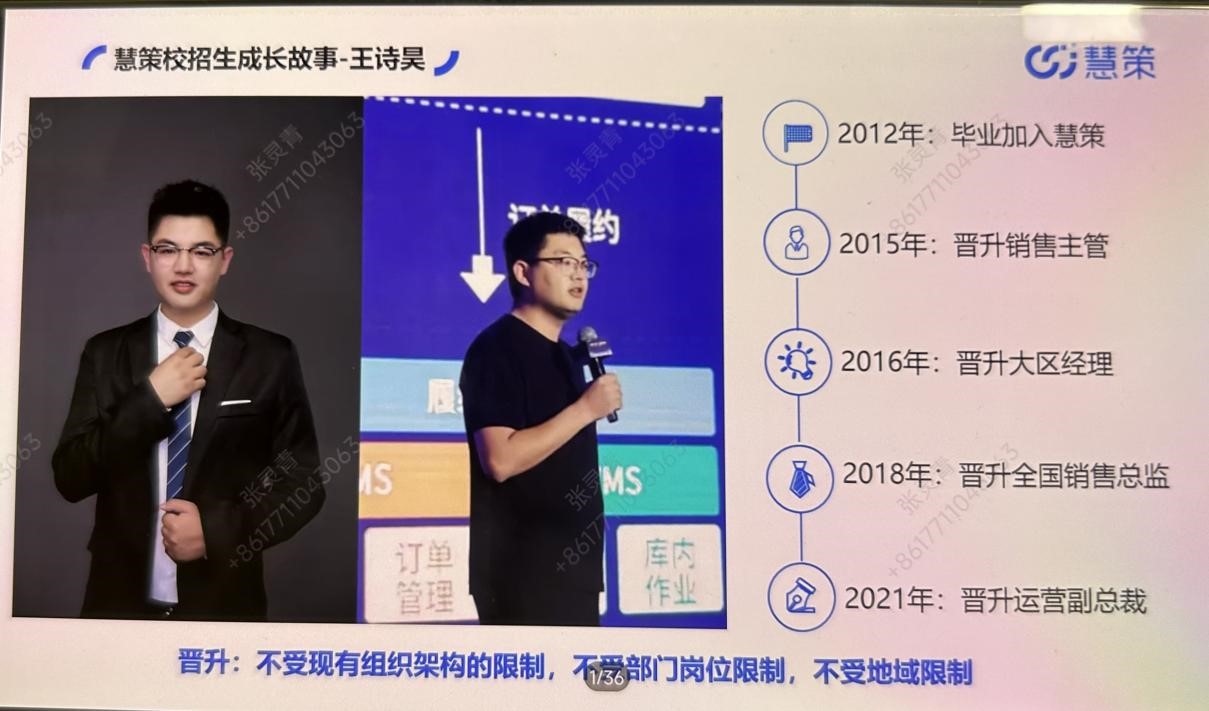 在会议的最后,HR为同学们展示了校招生的优秀成长故事,同时表明企业可以为2025届毕业生、2026届实习生提供全岗位实习机会,支持“实习+就业”一体化发展。销售管培生、人力专员等岗位对经管生优先开放,注重综合素质与沟通能力。入职后可享一对一导师带教、定制化学习计划及轮岗机会。慧策集团作为智能零售领域的标杆企业,其人才培养体系与公司育人理念高度契合。期待更多员工把握机遇,在实战中成长为行业亟需的复合型人才。