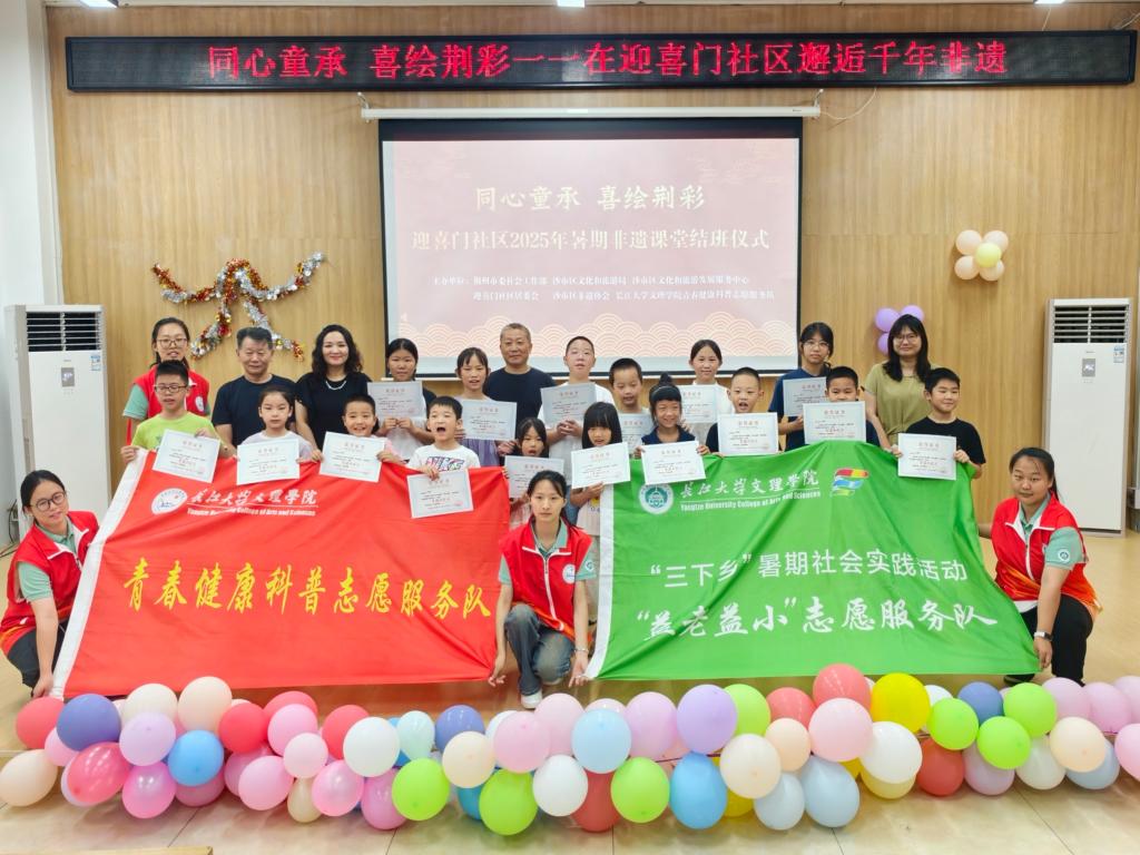 “我宣布,迎喜门社区2025年暑期‘同心童承,喜绘荆彩’非遗学堂正式结营!”在龚箐书记的宣布声中,全场响起持久的掌声。随后,学员、家长、志愿者与领导们齐聚舞台,拉起“太阳集团tyc9728青春健康科普志愿服务队”与“益老益小'志愿者服务队”,在镜头前留下充满意义的大合影。
