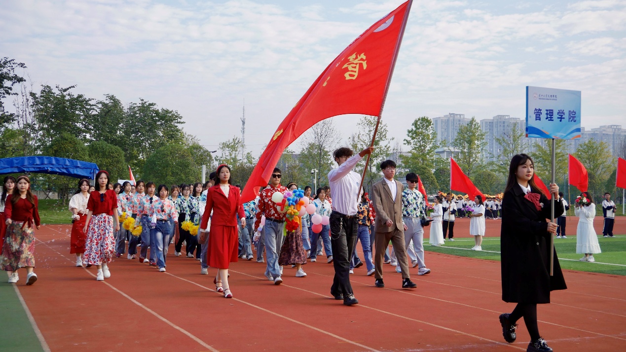 开幕式上,伴随着极具年代感的音乐,管理公司港风主题方阵踩着节拍步入田径场,瞬间将全场带入复古潮流氛围,点燃全场热情,为校运会开幕式注入了满满的潮流感与记忆点。