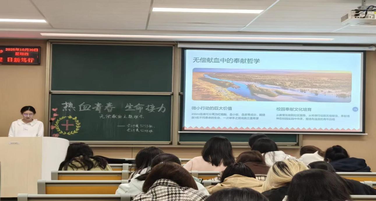 班会围绕荆州市中心血站汇报PPT为核心素材,从“为何献血”、“献血的益处”、“献血常识普及”及“荆州血液紧缺现状”四个维度展开讲解。通过真实案例让同学们了解到,血液作为不可人工替代的特殊物质,是意外事故、重大手术患者的“生命之源”,每一次的无偿献血,都将汇成改写生命的温暖力量。在讲解到献血益处时,面对同学们的疑惑与犹豫,注会5243班的金琳峰同学主动走上讲台向同学们分享自己献血的经验与感受,为同学们厘清献血误解,树立正确的认知,并总结道:“献血不仅对身体无害,还能促进新陈代谢,有时候甚至可以挽救一条鲜活的生命,无论是对自己、他人还是社会,都极具价值与意义,值得每一位同学去参与。”