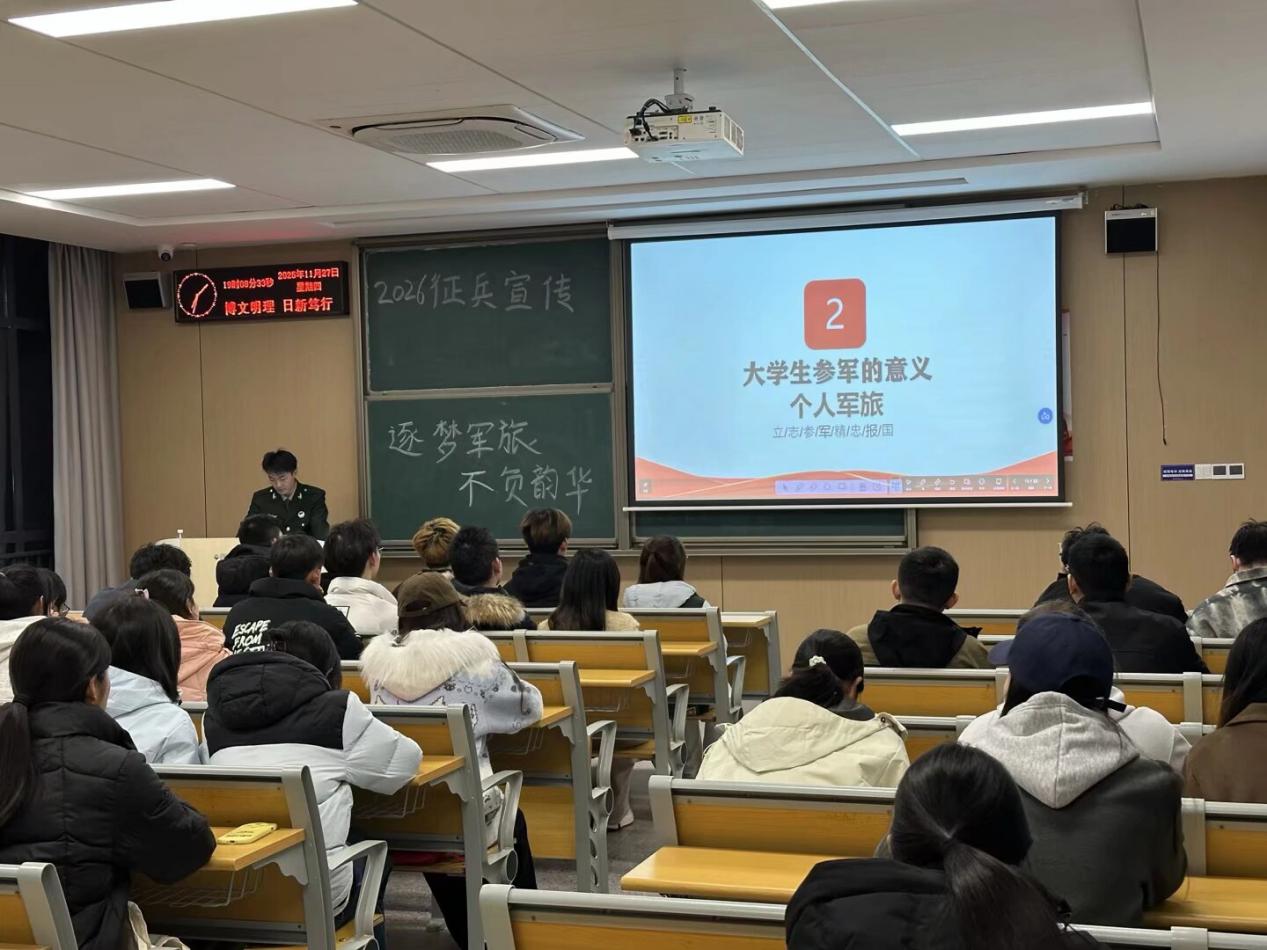 本网讯(通讯员 杜锡熳)为深入贯彻落实2026年征兵工作部署要求,切实激发青年员工参军报国的责任感与使命感,11月27日,由管理公司组织的2026年征兵宣传专题宣讲会顺利举行。本次宣讲会以“逐梦军旅,不负韶华”为主题,特邀工商管理s5251班刘传海担任主讲人。