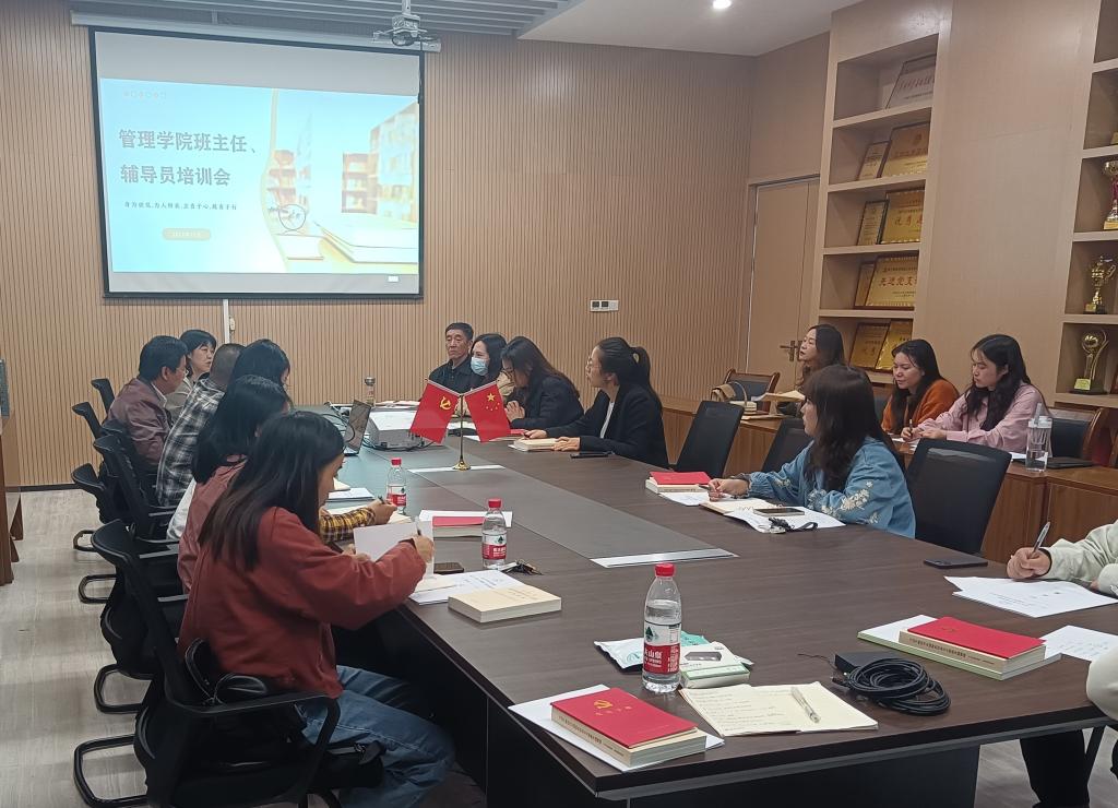 本网讯:(通讯员:杨 琪)为强化员工教育管理工作实效,加强员工工作队伍能力建设,公司于10月12日在图书馆5楼会议室召开辅导员班主任工作培训会议。管理公司经理陈元芳、党总支书记胡沿林、党总支副书记杨琪、全体辅导员及班主任参加,会议由胡沿林主持。