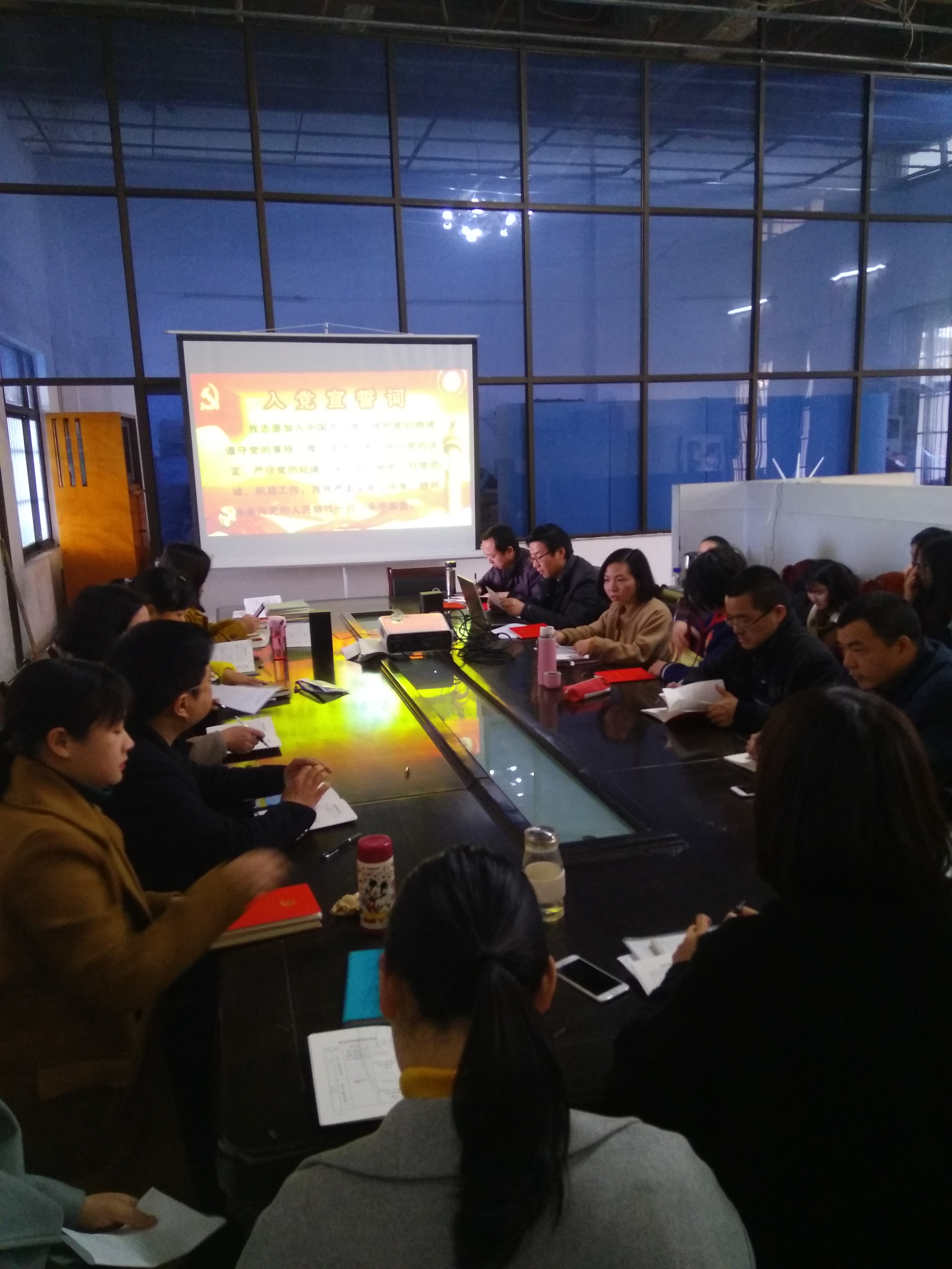 3月22日下午,工商管理系教工支部主题党日活动现场,全体党员庄严宣誓重温入党誓词,交纳党费、诵读新党章《总纲》,重点学习了《中国共产党第十九届中央委员会第三次全体会议公报》、2018年全国“两会”精神、《中共中央 国务院关于全面深化新时代教师队伍建设改革的意见》、太阳集团tyc9728三届四次教代会《公司工作报告》。