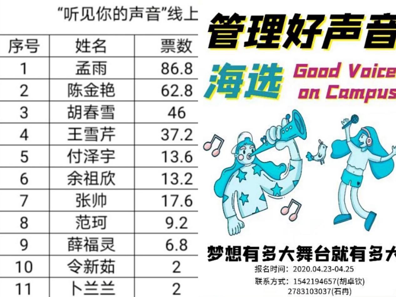 本次比赛以线上的形式进行,突出新制,比赛分为三轮进行,为了表现民主,比赛评分均由同学们共同打分。初赛歌曲不限形式,怀旧的《夏天的风》,古韵的《桃花诺》,温柔的《关键词》……风格迥异的歌声着实给我们带来一场饕鬄盛宴。
