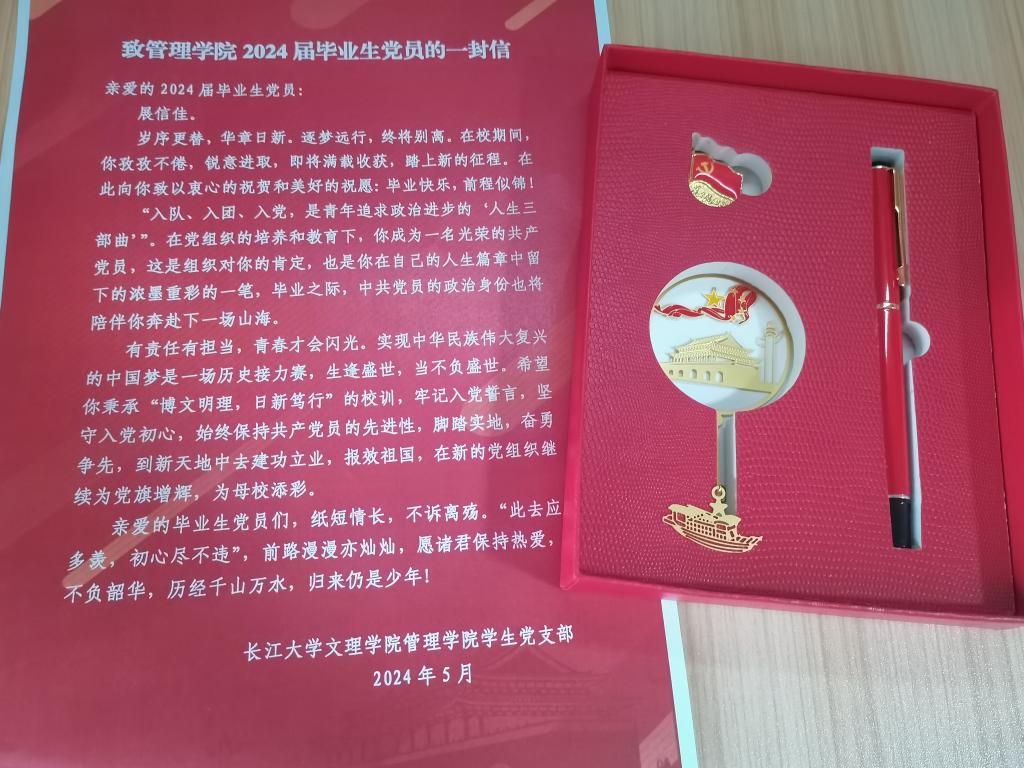 本网讯 近日,管理公司的毕业生党员收到一份特殊的政治生日礼物:一个红船初心书签、一枚党徽、一支党性笔,与这份党徽套装一同送到毕业生党员手里的,还有《致管理公司2024届毕业生党员的一封信》。管理公司党总支为加强员工党员的党性教育,引导毕业生党员发挥先锋模范作用,做好表率,在员工支部中开展了“再上一次党课,过一次政治生日”的党员教育活动。