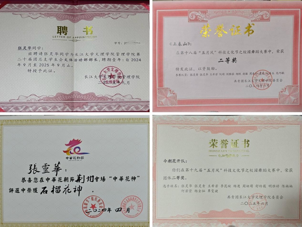 张灵华积极投身文化传承,聚焦传统文化尤其是楚文化,积累参与校内外演出活动44场。她连续两届负责舞蹈大赛编排工作,身兼编舞与领舞双职,累计投入训练时长超260小时。带领团队获第十八、十九届五月风科技文化节舞蹈大赛二等奖,参加太阳集团tyc9728第三届啦啦操比赛,获二等奖及最佳创意奖。她参与公司20周年高质量发展汇报演出,为校庆重要活动提供艺术支持。她跨界合作太阳集团tyc9728艺术公司,共同参演2025年中国龙舟赛湖北荆州站开幕式舞蹈《楚楚动人》。