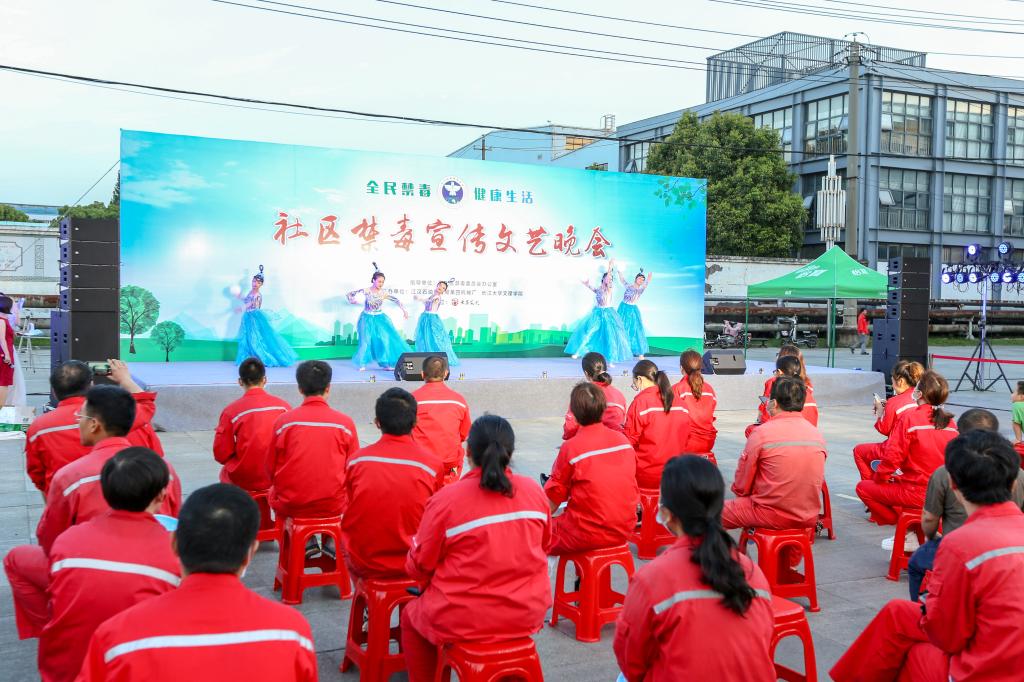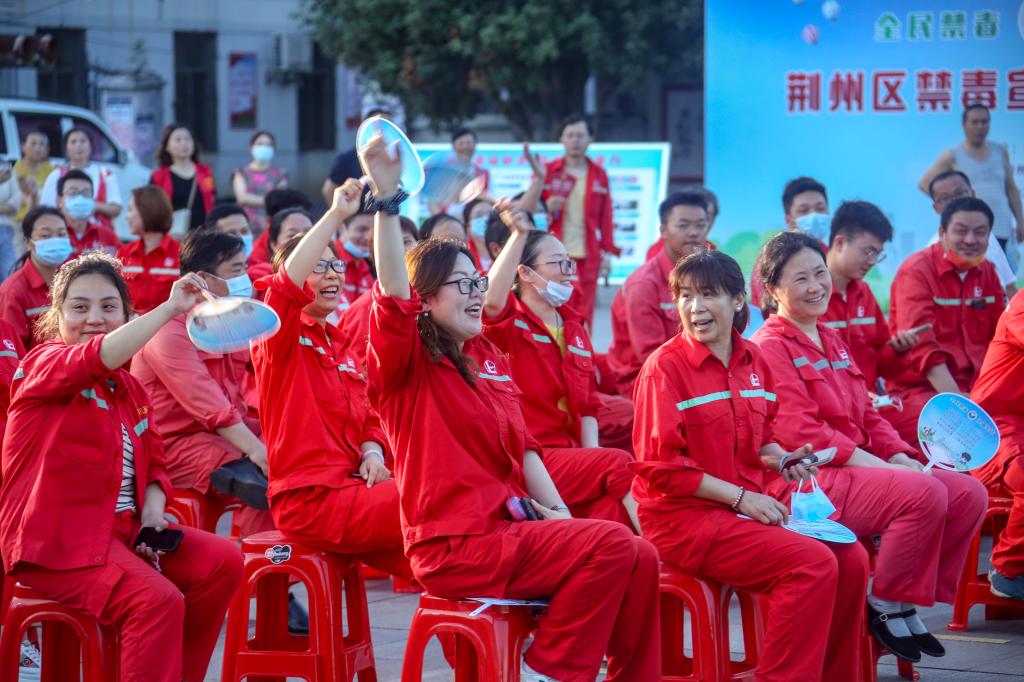“为了万千百姓的安宁,我们牢记使命不改初心,不管骄阳似火,还是狂风暴雨,我们义无反顾地勇敢前行……”6月22日晚,在《利剑雄鹰》禁毒歌曲中,社区禁毒宣传文艺晚会在荆州区新南门四机路四机厂文体广场正式开始,歌曲《怒放的生命》、音乐快板《远离非法集资》、和诗朗诵《禁毒,我们一直在路上》等节目以舒缓的节奏将拒绝毒品的誓言潜移默化的深入我们每个人的心中,洗涤我们的心灵,精彩的节目博得了现场群众的阵阵热烈掌声。