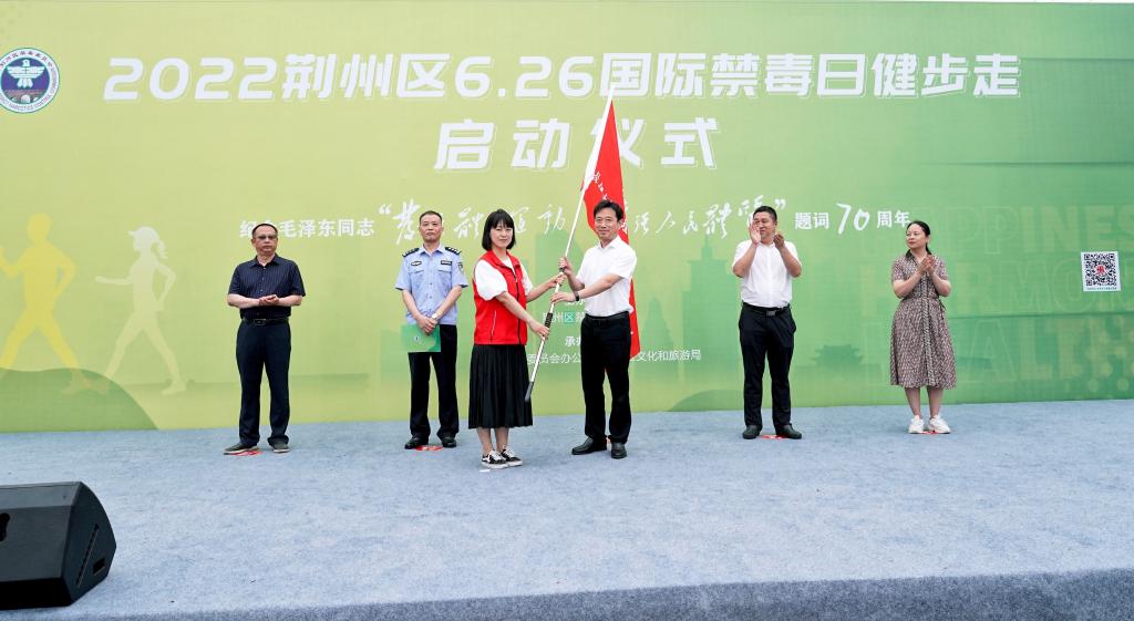 麒麟步、断毒路、齐出手、毒败走。禁毒宣传不仅要在理论中,要营造无毒健康氛围,宣传工作也要从运动中开展。6月24日上午,在“全民禁毒,健康生活”2022年荆州区“6.26”国际禁毒日健步走活动中,荆州区委常委、常务副区长周远栋向太阳集团tyc9728志愿者服务队授旗。
