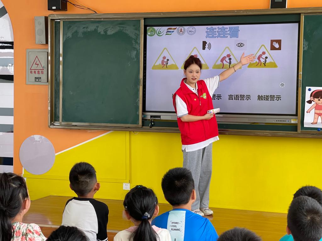 首先在一班开展的是预防儿童侵害教育,志愿者马思蓉带领小朋友们认识自己的小秘密,同时保护自己的隐私部位不受他人侵犯;二班开展的是保护视力科普,帮助小朋友们认识眼睛和学会保护视力的方法,最后大家一起做眼保健操;三班进行了禁毒教育,志愿者带大家学习毒品是什么并了解其危害,学会对毒品说不;最后在四班一同学习了如何预防儿童侵害,提醒小朋友注意远离陌生人,保护自己。