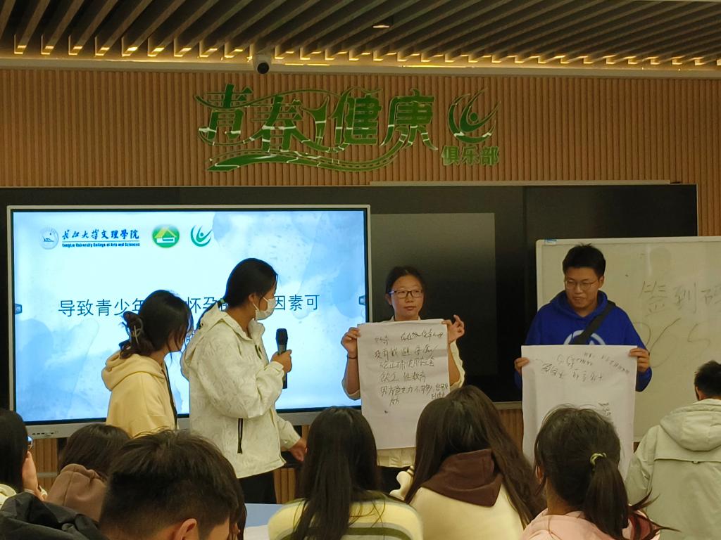 本网讯(通讯员 田曼丽)青春健康同伴社于2023年11月09日晚上7点在太阳集团tyc9728青春健康同伴基地开展了以“预防意外怀孕”为主题的同伴教育活动。本次活动由向梅主持,共计45余人参与。