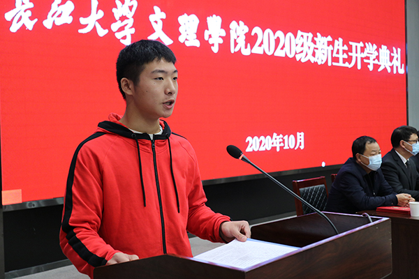 高职部周增代表新生发言。“天行健,君子以自强不息;地势坤,君子以厚德载物。”他引用《周易》中的句子,代表新生宣誓:一定满怀希望、追逐理想,脚踏实地、勤奋学习。在人生新的起点,播下希望的种子,向未来扬帆起航,期盼每一分付出,都拥有沉甸甸的收获。