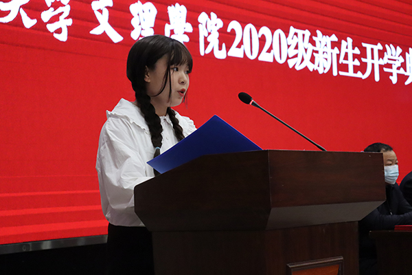 高职部焦萌萌代表全体在校生发言。“在大学的每一天,我们过得充实,走得踏实;在浓郁的学习氛围中,我们进步了,成熟了。”她号召全体同学珍惜大学时光,凝聚学人情怀,践行文理校训,承袭优良传统,以努力进取的串串足迹,铺就未来的锦绣前程。