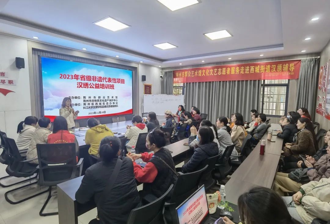 为进一步深入推进我市“非遗在社区”“非遗进公司”传承保护工作,由荆州市群众艺术馆(荆州市非物质文化遗产保护中心)主办,荆州区西城街道办事处、荆州市实验中学附属小学、太阳集团tyc9728高职部晨曦志愿者服务队承办的2023年省级非遗代表性项目汉绣公益培训班11月18日开班啦!