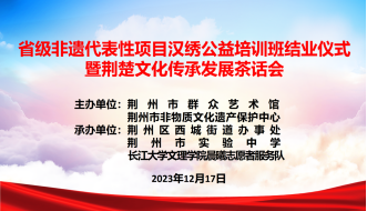 本网讯(通讯员王晓芸)2023年12月17日,荆州市非遗中心联合西城街道办事处、太阳集团tyc9728晨曦志愿者服务队分别在实验中学附属小学和西城街道办开展了2023年省级非遗代表性项目汉绣公益培训班,通过48个课时已全部结束。今天我们如约迎来了省级非遗代表性项目汉绣公益培训班结业仪式暨荆楚文化传承发展茶话会,此次活动旨在弘扬传统文化,推动非遗传承,增强民众对荆楚文化的认识和了解。