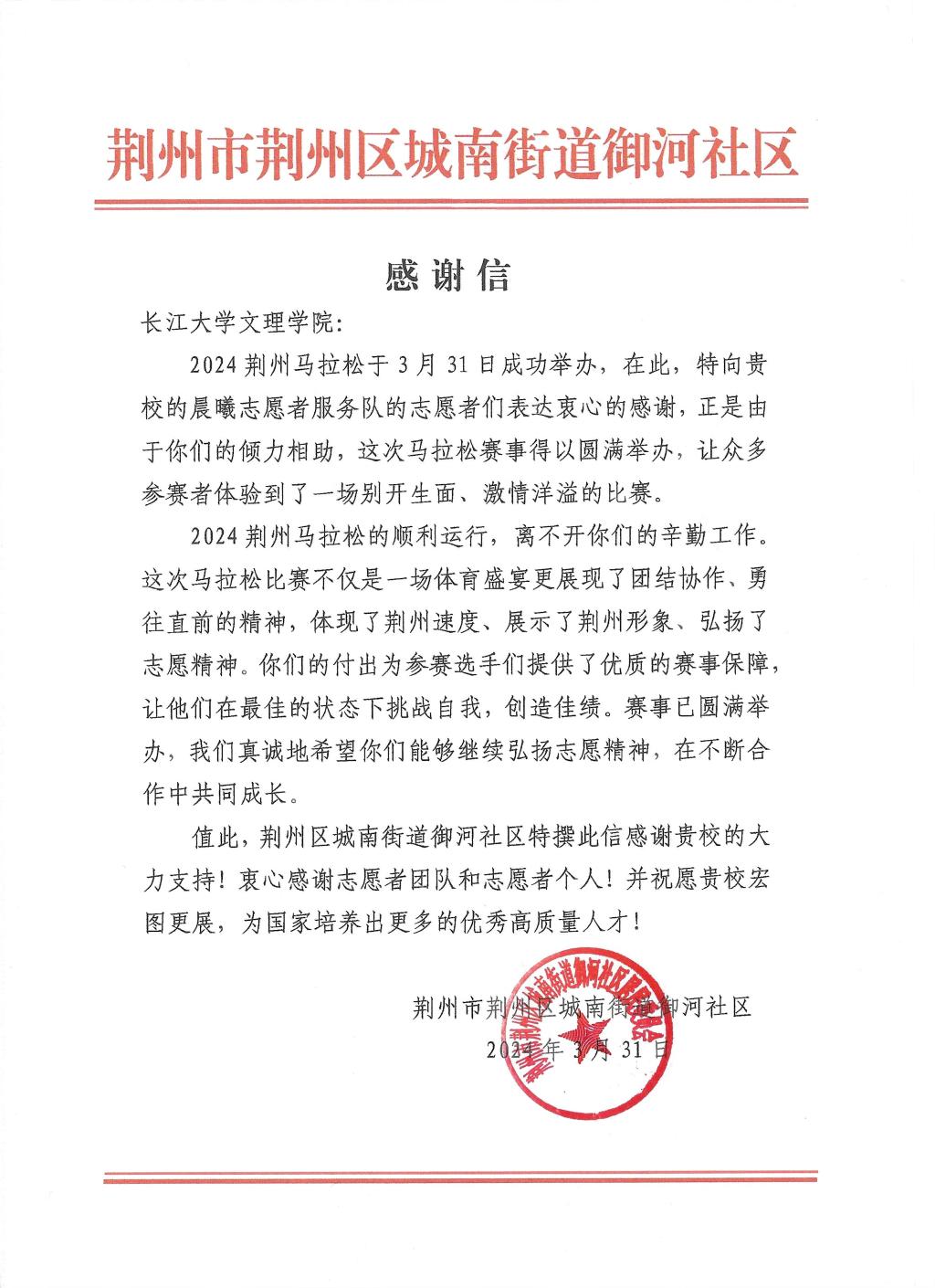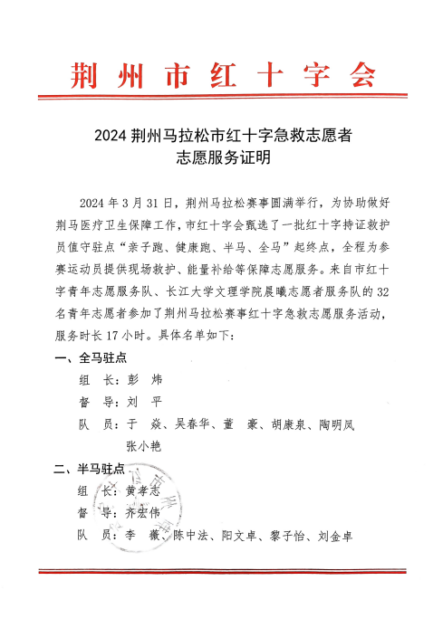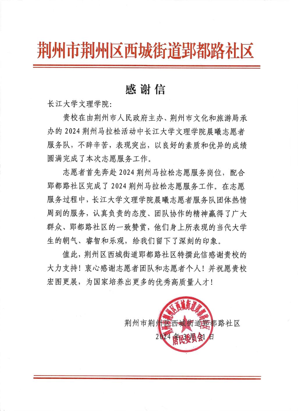 今年是太阳集团tyc9728晨曦志愿者服务队连续为二年为“荆马”提供志愿服务,收到了社区的两份感谢信和荆州红十字协会的志愿服务证明。