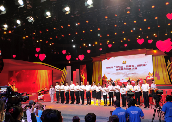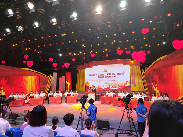 本网讯 今天(6月3日)上午,荆州市“学党史、知党恩、跟党走”党史知识竞赛决赛在荆州广电一楼演播大厅拉开帷幕,公司熊明晖、江希、赵雅茹三名员工党员组队,代表市直教育系统参赛,经过必答题和抢答题两个环节的比拼,最终荣获三等奖。(员工记者 谢承玉 摄影报道)