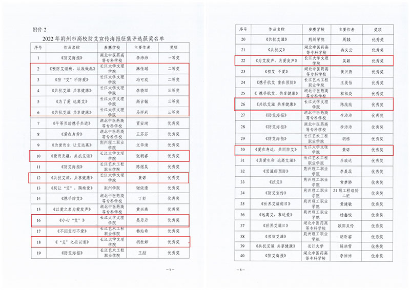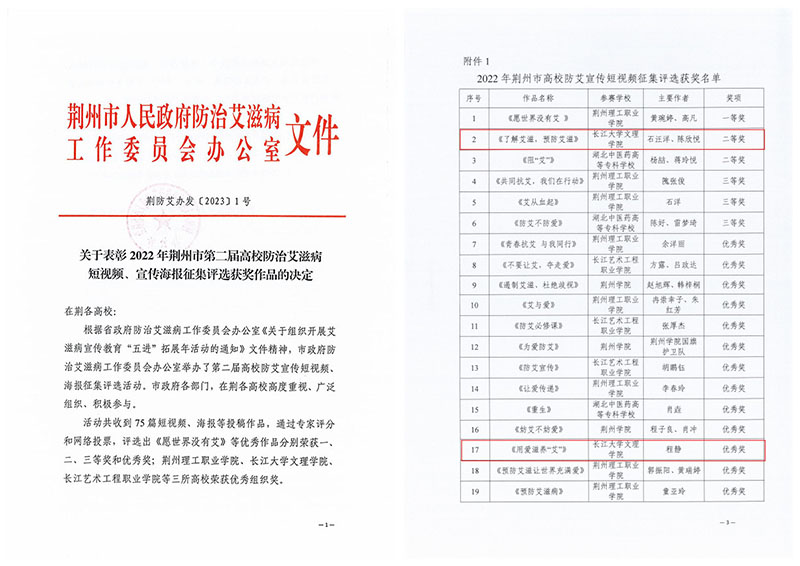 本网讯 近日,2022年荆州市第二届高校防治艾滋病短视频、宣传海报征集评选结果揭晓,公司获优秀组织奖,员工作品获二等奖3项、三等奖3项、优秀奖8项。