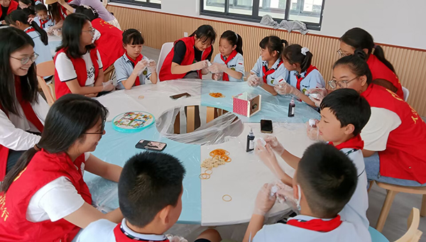 5月18日,人文与传媒公司青年志愿者赴民主社区新时代文明实践站开展助学支教服务活动,带领荆州小学10余名员工制作中国结和扎染作品,传承非遗文化。