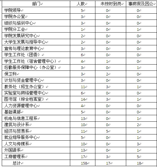 严格遵守工作纪律是公司对全体教职工的一项基本要求,本次考勤检查虽事先作了通知,但部分单位工作人员到岗情况仍不理想。公司要求有关单位责任人应进一步加强管理,规范请假报批制度和临时离岗登记制度,严肃工作纪律,维护公司行政办公、教学管理及员工管理工作秩序。本次检查暂不通报具体人员,后期人力资源管理中心将继续开展不定期抽查,对出现无故不按时到岗、中途脱岗、早退等现象的人员进行实时通报,并按有关规定予以处理。