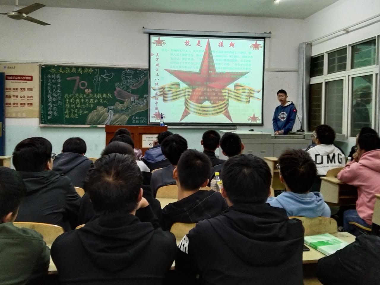 团课上,通过讲解、观看视频,同学们重温抗美援朝历史,祭奠缅怀先烈,学习习近平总书记在纪念中国人民志愿军抗美援朝出国作战70周年大会上的讲话,围绕“抗美援朝的深刻意义”展开讨论,并依次上台讲述自己的体会和感受。会议结尾,主持人对同学们的发言进行总结,他呼吁同学们要牢记时代使命,继承先辈遗志,为新时代中华民族的伟大复兴而不懈奋斗。