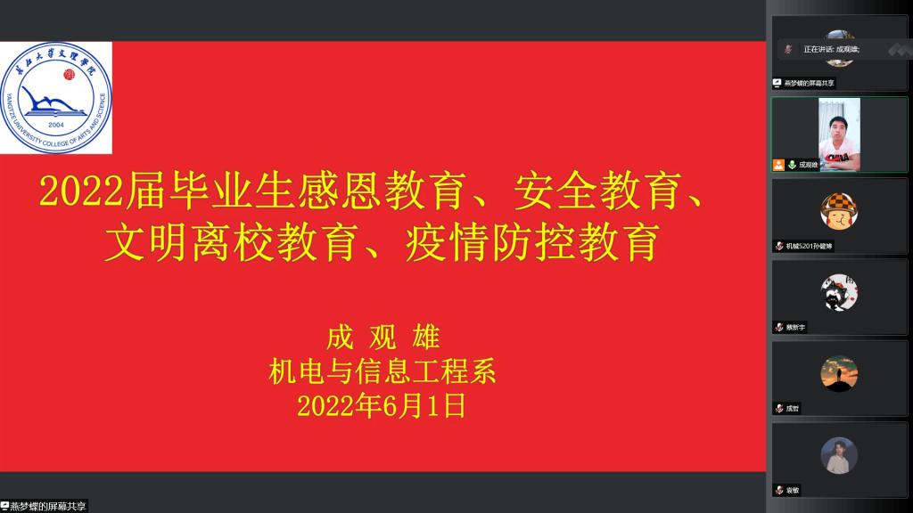 本网讯(员工记者 吴家佳)为保障毕业生安全离校,进一步做好国家助学贷款工作,加强毕业生的感恩与诚信意识,6月1日晚,我系以线上形式开展了2022届毕业生安全离校及感恩教育大会。会议由系辅导员成观雄主持,2022届全体毕业生参加。