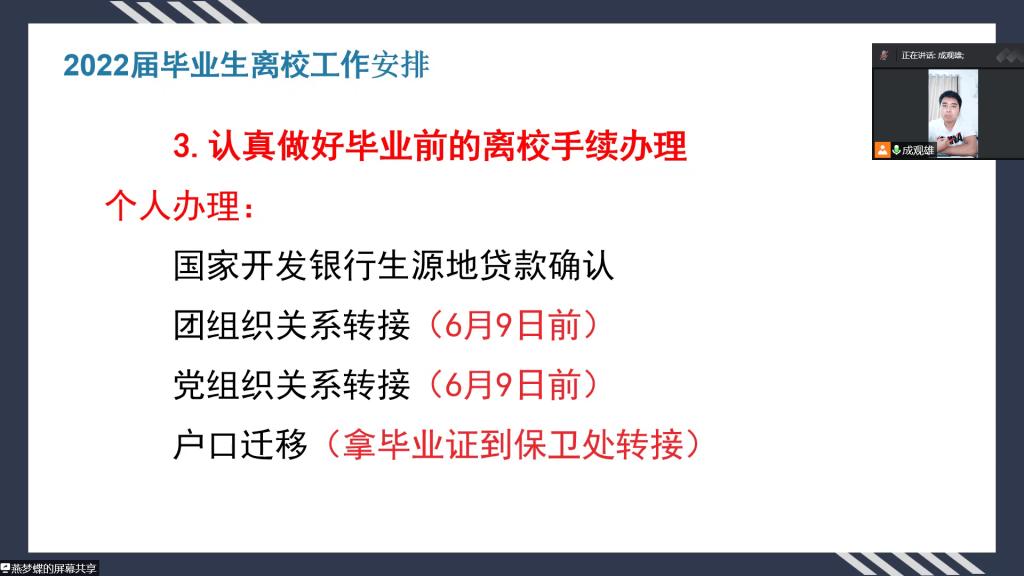 会议上,成观雄围绕“日程安排”、“手续办理”、“关系转接”、“就业工作”等方面,向同学们详细介绍了毕业生在校期间应完成的后续任务,确保离校工作的顺利进行。他强调,毕业生应遵守校纪校规,严格按照公司离校工作日程安排表执行;在校期间注意安全,做到疫情防控和毕业生工作两不误。