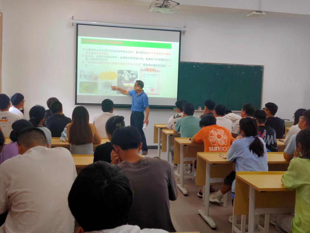 宣讲会上,材料科学与工程公司硕士生导师罗成教授以“要不要考研?”、“考研选择什么专业?”两个问题开场,阐述了考研的益处和当前汽车行业的发展前景,并围绕“特色专业”、“团队力量”、“科研成果”、“合作对象”、“奖助体系”、“生活条件”六个方面对湖北汽车工业公司进行介绍,带领同学们深入了解该院的发展历程、招生专业、科研平台和就业与职业发展。最后,他向同学们展示了该院的研究生选拔标准和人才培养计划,鼓励同学们积极报考、继续学习,用知识武装头脑,用实践开拓未来。