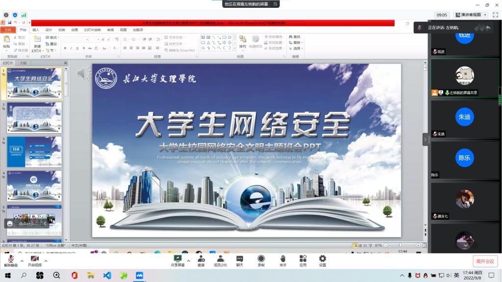 本网讯(员工记者 王艺果)9月7日晚,我系开展了老员工校园网络安全文明主题班会。班会由辅导员主持,各班全体同学参加。