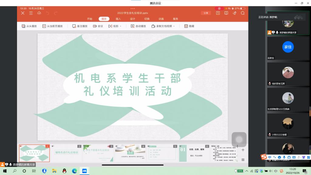 本网讯(员工记者 李学哲 王鑫)10月26日,在腾讯会议平台上,我系开展员工干部基本礼仪培训活动。活动由秘书处余书宏主持,系辅导员燕梦蝶主讲,第十八届团学组织全体成员及各班班委参加。