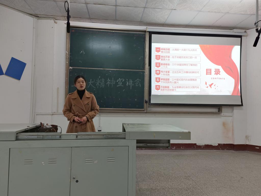 宣讲会上,史苗苗老师对党的二十大的主要议程、重大意义进行详细介绍,用15个关键词带领我们了解党的二十大,随后向与会人员阐述了习近平新时代中国特色社会主义思想的重要时代成果,提出自觉弘扬伟大建党精神,坚定树立对马克思主义的信仰,坚定对中国特色社会主义的信念的要求。最后擘画蓝图:“以中国式现代化全面推进中华民族伟大复兴”,号召全体师生要自觉肩负起为中国人民谋幸福,为中华民族谋复兴的初心和使命。