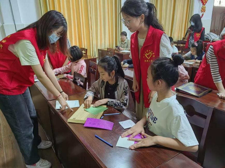书法课上,志愿者们认真教孩子们书写姿势,带领他们学习了一些简单的字和诗句。通过志愿者对古诗的讲解,能让孩子们沉浸在诗词文化中,更直观地感受古诗的韵律之美、景色之美、情感之美。国学课上,志愿者介绍革命书籍《闪闪的红心》,通过一段视频向孩子们介绍了小英雄潘东子的事迹,还为孩子们补充了两万五千里长征、飞夺泸定桥、血战湘江等能彰显中国共产党的伟大历程的故事,一个个动人心魄的历史事件使孩子们深受启发,让他们深刻体会到今日的幸福来之不易,是无数革命先烈用鲜血换来的,更让员工深刻感悟百年大党的责任与担当。