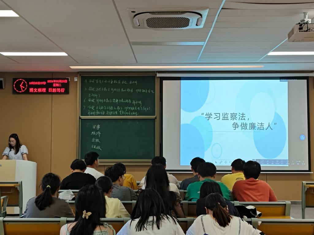 为了让同学们了解监察法的背景意义与主要内容、明确检查工作的原则,各辅导员组织观看视频,以相关案例为例,讲述廉洁自律故事,并组织大家围绕“老员工应该如何做到‘修德求真’、如何做一个廉洁人等问题”展开讨论。