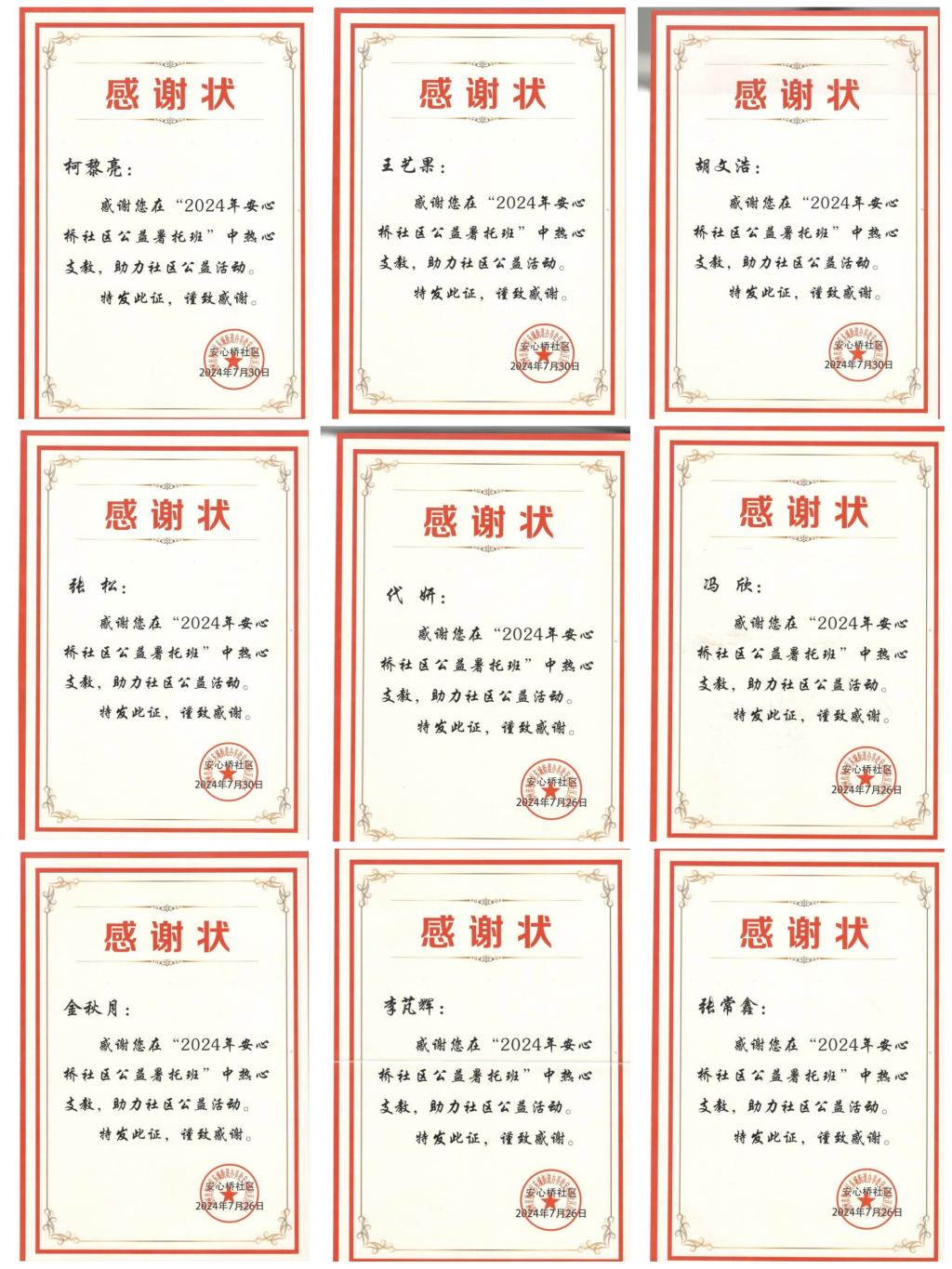 本网讯(通讯员 柯黎亮/文 柯黎亮/摄)2024年暑期,在荆州市荆州区东城街道办事处安心桥社区开展的“‘暑假学堂’爱心托管班”社会实践活动中,公司柯黎亮等9名同学积极践行“奉献、友爱、互助、进步”的志愿者精神,出色地完成了志愿服务工作。