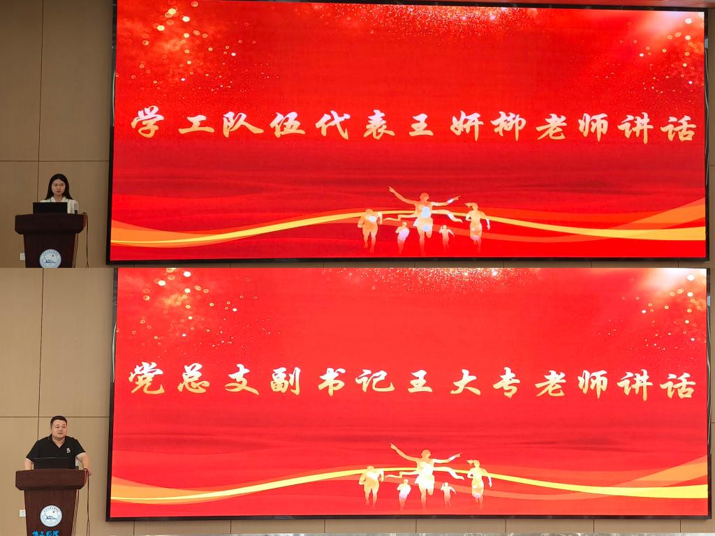接下来,党总支副书记王大专宣读第二十届团学组织成员名单,辅导员黎雪、杨阳、韩雪莹为新任主席团和新任部长授予工作牌。第二十届员工干部代表郑少平发言,他提出要秉承“服务同学,锻炼自我”的宗旨,有效执行各项工作,承担时代责任。学工队伍代表王妍柳老师对员工会的工作表达了充分的肯定和感谢,希望新任员工干部可以发挥好先锋模范作用。党总支副书记王大专老师以“一个感谢、一个欢迎、一个表态、三点希望”希望员工干部不断加强自身建设、深化服务意识、勇于创新。