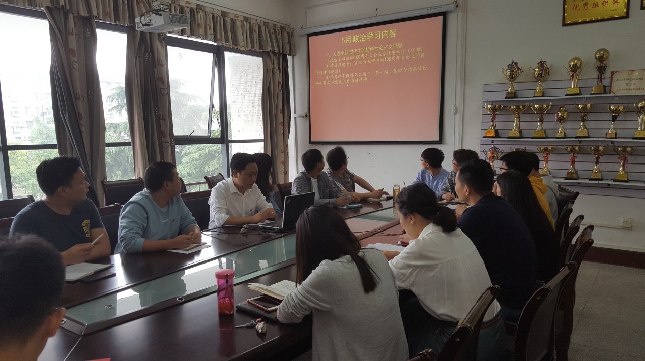 政治学习阶段,在习近平新时代中国特色社会主义思想专题学习中,集体观看了纪念五四运动100周年大会视频,学习了习近平总书记在纪念五四运动100周年大会上的讲话、习近平出席第二届“一带一路”国际合作高峰论坛开幕式上的主旨演讲精神等。