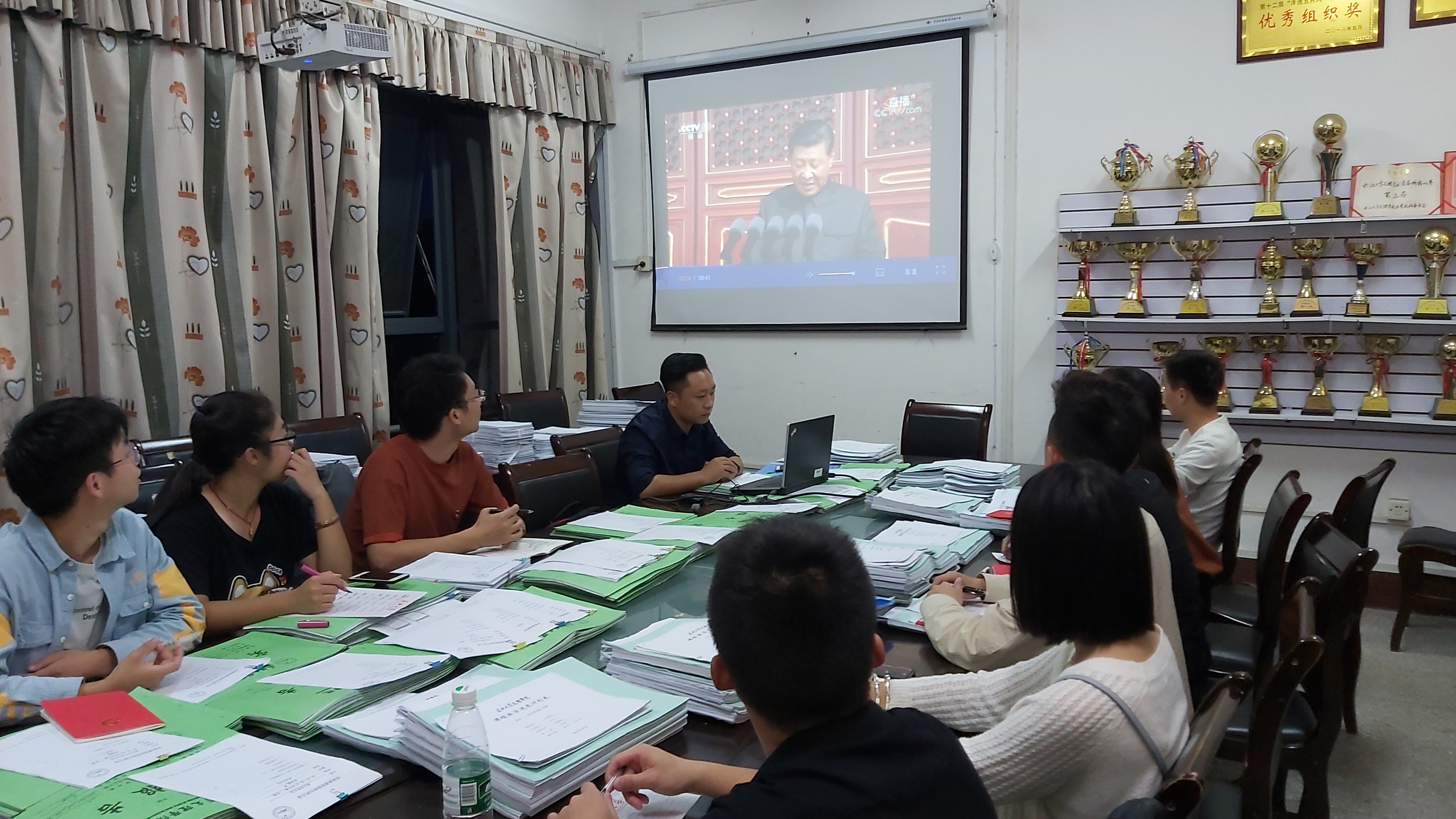 会议伊始,全体党员一同学习习近平新时代中国特色社会主义思想,观看中华人民共和国成立70周年庆祝大会视频,并学习习近平总书记在庆祝中华人民共和国成立70周年大会上的重要讲话精神、新华社发表的“让爱国主义旗帜永远高扬”——礼赞 70 年新中国的文章内容和习近平在国家勋章和国家荣誉称号颁授仪式上的讲话精神等。