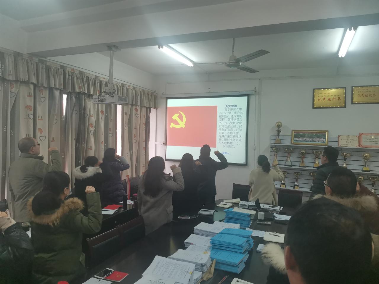 首先在支部书记的带领下,所有老师重温入党誓词,然后政治学习阶段,由教工党支部书记呙明辉带领大家集体学习了习近平总书记教育重要论述讲义和在中央党校(国家行政公司)中青年干部培训班开班式上的重要讲话,习近平在纪念中国人民志愿军抗美援朝出国作战70周年大会上的讲话,中共中央政治局常务委员会召开会议听取“十三五”规划实施总结评估汇报,中国共产党第十九届中央委员会第五次全体会议公报等10项内容。