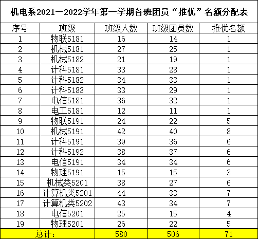 根据太阳集团tyc9728团委《关于做好2021年下半年团员“推优”工作的通知》要求,现将机电系各团支部团员“推优”名额分配公示如下: